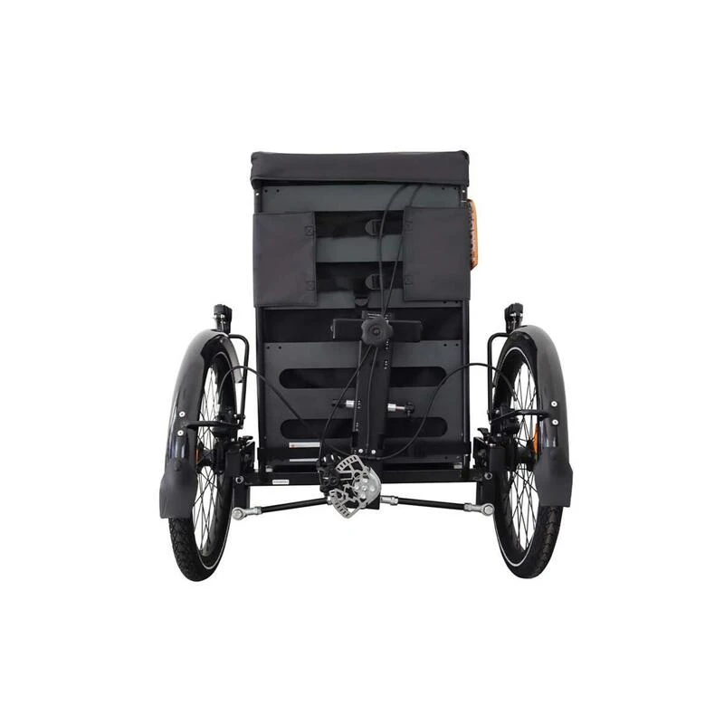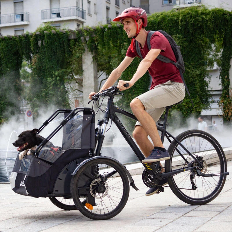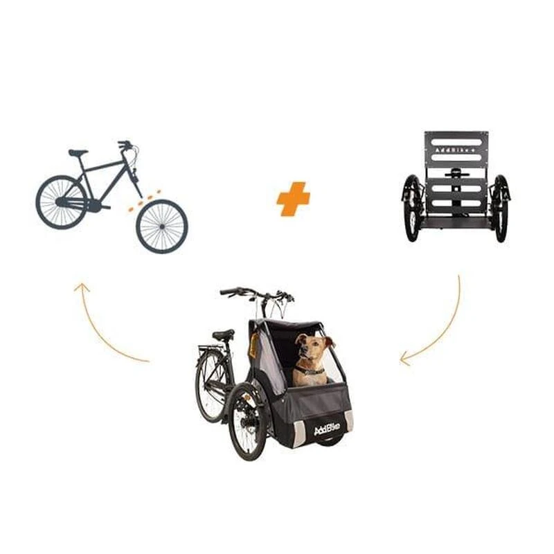 Conçu pour effectuer des trajets quotidiens en ville avec votre chien en toute sécurité et confort. C’est très simple : transformez votre propre vélo en tricycle !